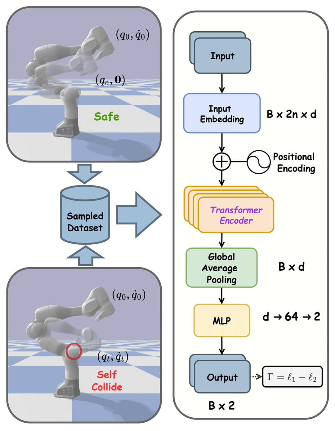 为学习这个可行集,作者使用了一个基于 Transformer 的神经网络分类器 Γ(q, q̇)。训练数据通过仿真生成:采样 300 万组 (q, q̇) 状态对,模拟制动过程并标注 —— 若制动轨迹无自碰撞则标为 viable,否则标为 non-viable。网络采用标准 Transformer-Encoder 架构(前馈维度 128、2 个注意力头、4 层堆叠),训练 30 个 epoch,测试集准确率达 99.27%,召回率达 99.74%。