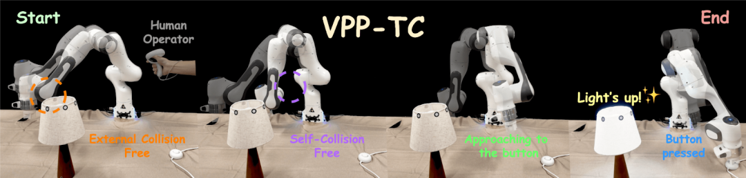 综合场景:遥操作按台灯开关任务 —— 仅提供粗略目标位置,无预计算的避障轨迹。VPP-TC 同时处理外部碰撞(台灯灯体)和自碰撞约束,安全完成任务。