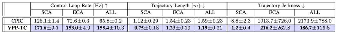 VPP-TC 在所有设置下都显著优于 CPIC:控制频率提升 1.4–2.4 倍,轨迹长度更短,轨迹抖动降低了一个数量级以上(特别是在 ECA 和 ALL 场景下)。