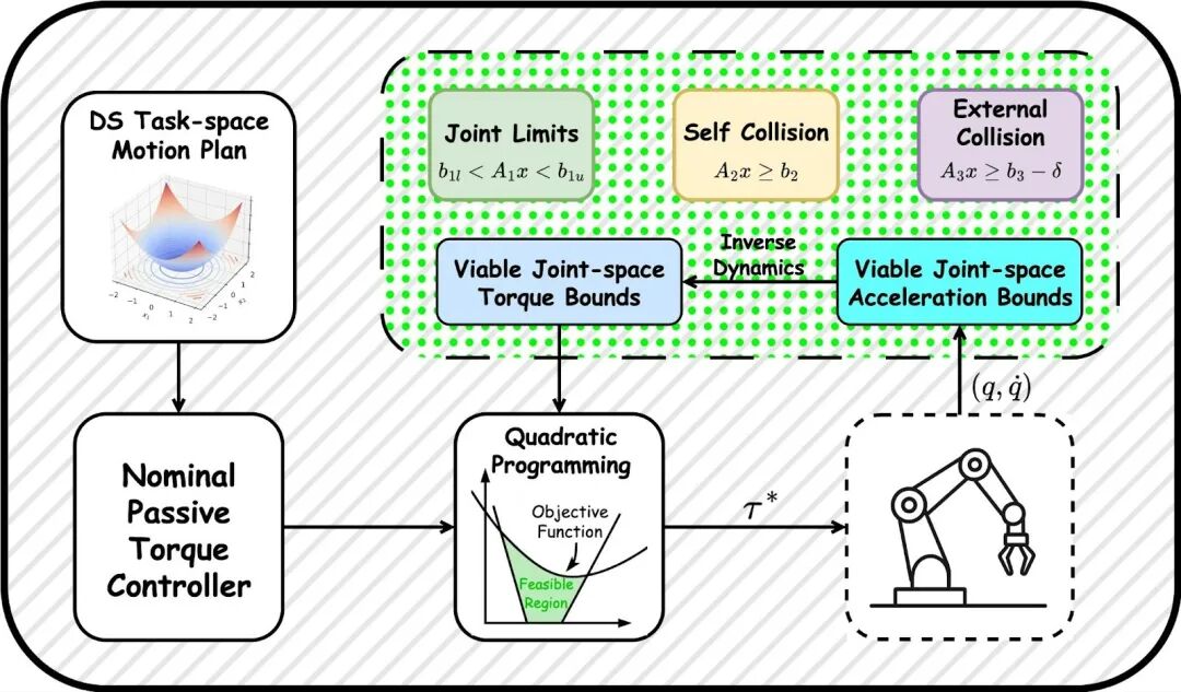 在物理人机交互(pHRI)场景中,机器人需要在与人类近距离协作时保持被动性(passivity)—— 即吸收的能量不少于释放的能量,从而保证在外部扰动下的鲁棒性和稳定性。经典的阻抗 / 导纳控制框架、Port-Hamiltonian 方法以及基于动力系统(DS)的被动力矩控制器已被广泛研究。