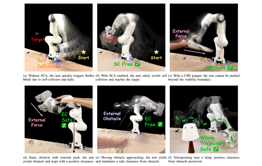 图 5:真机实验。上排:自碰撞避免(a-c)。下排:外部碰撞避免(d-f)。轨迹叠加显示约束激活后机械臂保持正向间距。
