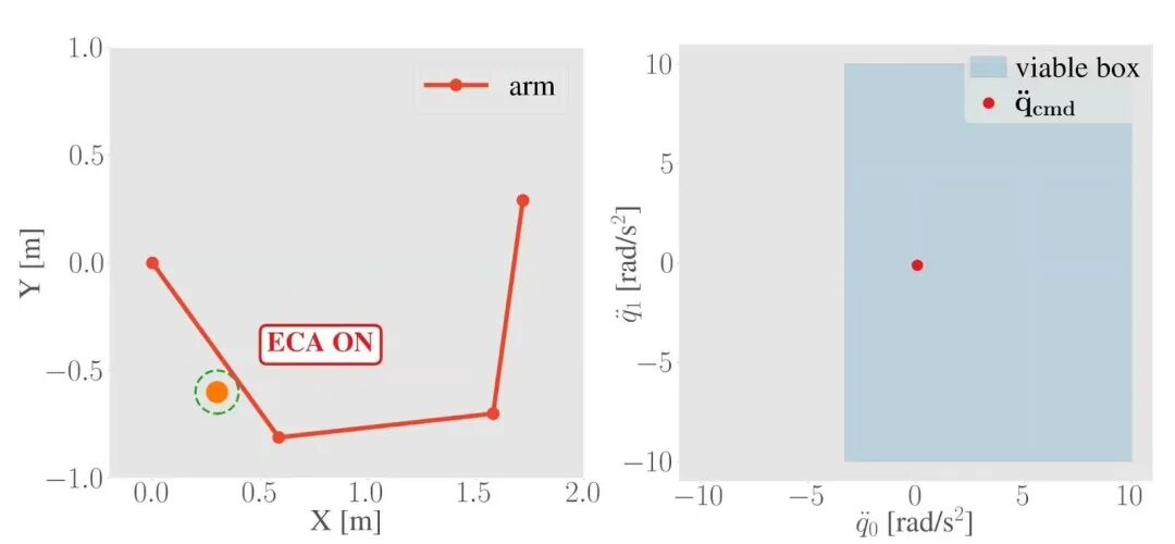 图 4:平面 3-DoF 示例。左:工作空间轨迹。右:在硬件限制 [−10, 10] rad/s² 下的可行加速度域。当外部碰撞约束激活时,允许的加速度域收缩。