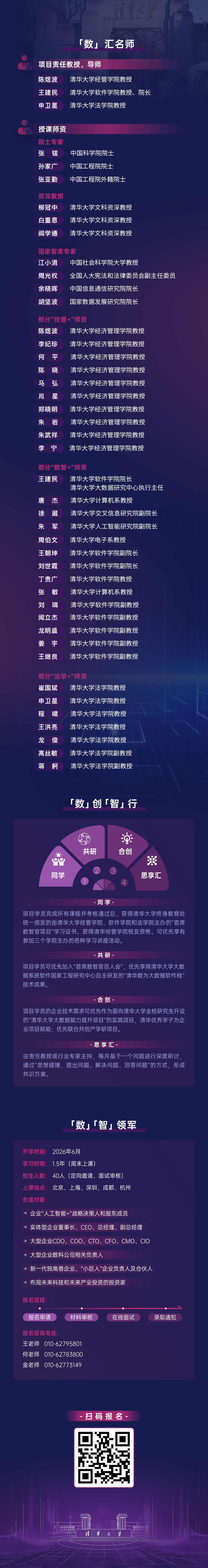 项目依托清华工科顶尖科研资源与国家智库力量,凝聚“经管+”、“数智+”、“法学+”三院学术精髓,致力于培养全球AI智能时代数智科技领军人才。 汇聚院士专家、资深教授与产业先锋,通过六维进阶课程与深度产研访学,助您将技术特点转化为业务价值,将企业数智化能力淬炼为全球化核心竞争力!