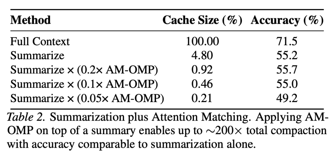 除了标准的 KV 压缩,论文还展示了一个极具启发性的扩展实验:如果先对长文本进行摘要,再在摘要内容之上套用 AM-OMP 算法,能够实现高达 200 倍的总压缩率,且精度与单纯使用摘要方法相当。