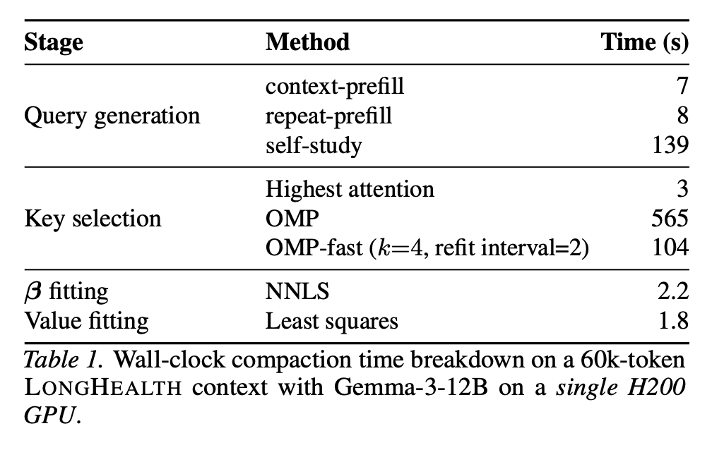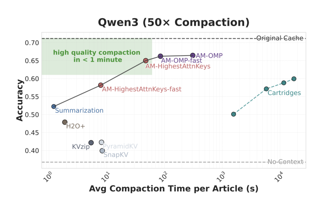〓 图5. 在 50 倍压缩率下,Attention Matching 方法勾勒出了压缩时间与精度的帕累托前沿