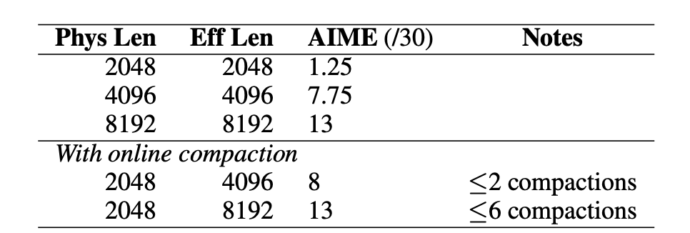这一结果证明了 Attention Matching 能够有效解耦物理内存限制与逻辑推理深度,关键的推理状态在反复的极速压缩中得到了完整保留。
