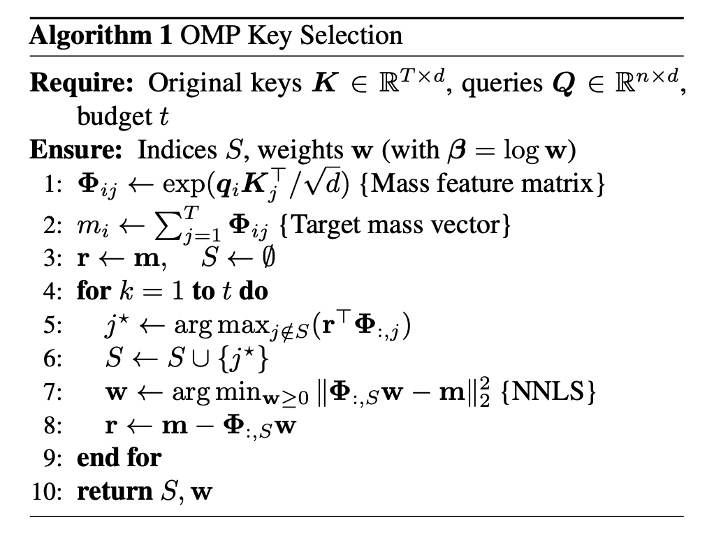 除了简单的最高注意力分数策略,研究团队引入了正交匹配追踪(OMP)算法,贪心地挑选能最大程度减小质量拟合残差的键。