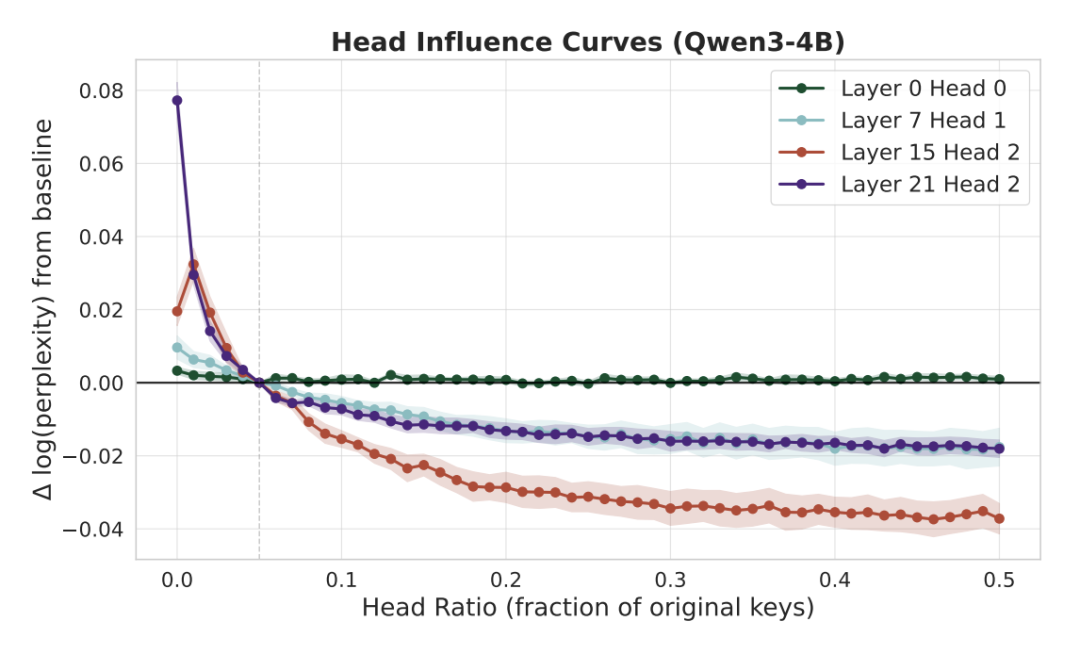 〓 图3. Qwen3-4B 模型中不同注意力头对 KV 容量变化的敏感度曲线