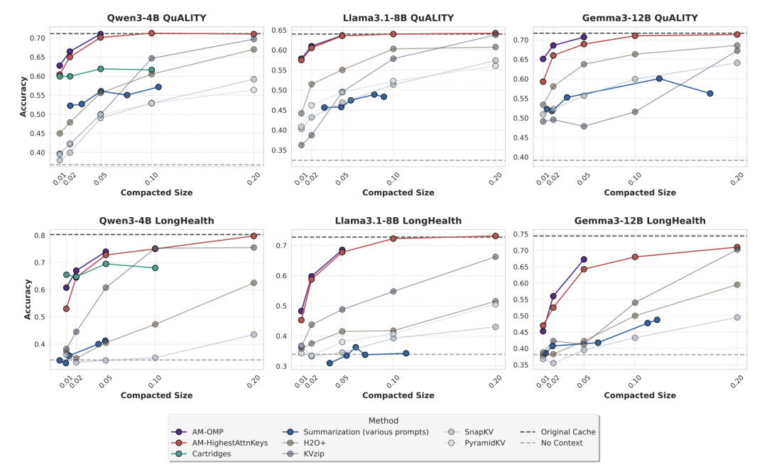 〓 图6. 跨模型与跨数据集的对比显示,Attention Matching 在高压缩区间持续保持领先,并在 50 倍压缩率下达到 Cartridges 的性能水平