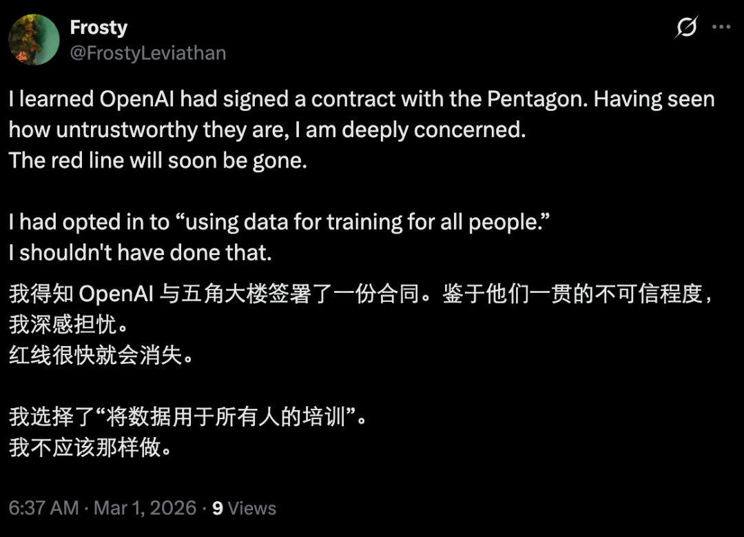 在这份声明发布后,外界的担忧并没有消除。有人质疑说,为什么看上去差不多的条件,OpenAI 就和国防部谈妥了,而 Anthropic 不行?是不是 OpenAI 的合同有更多灵活空间?
