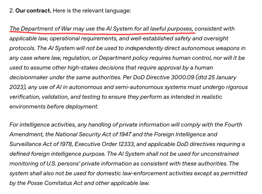 为了回应外界的质疑,OpenAI 今天一大早就发布了一则新的声明,称他们的合同包含「三条红线」,对国防部有足够的制约。