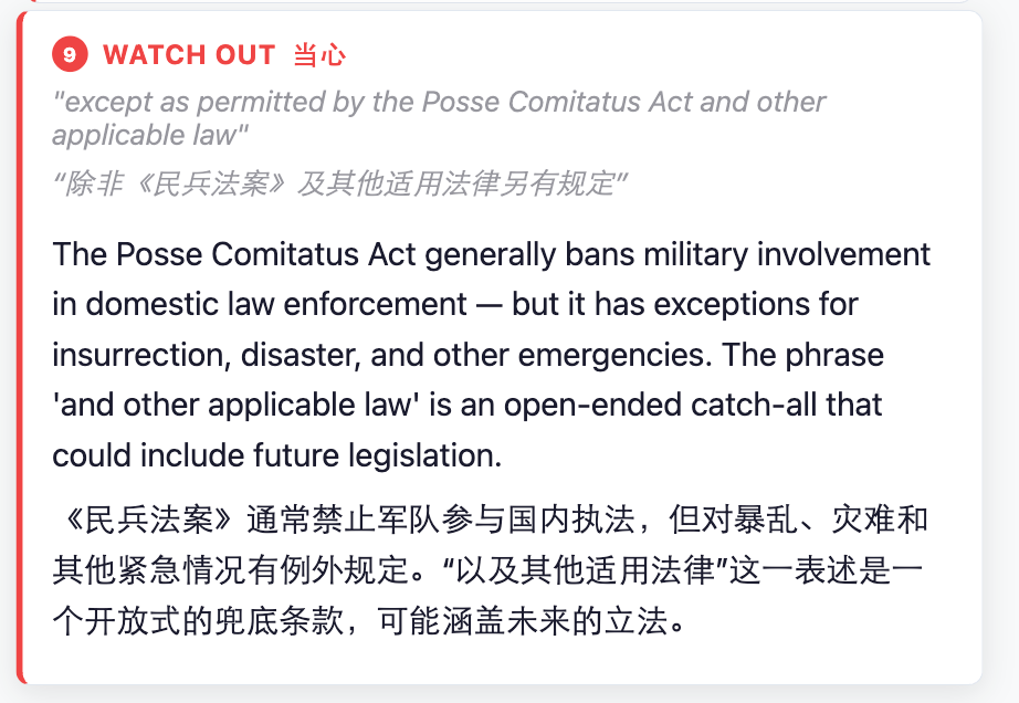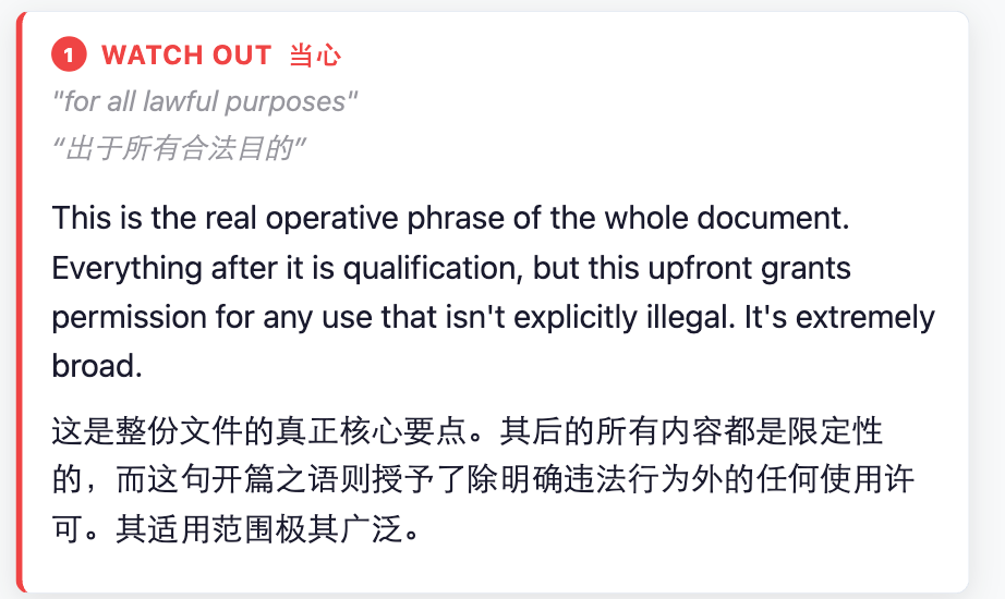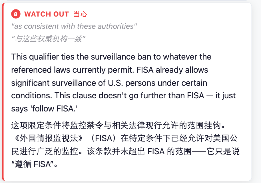 基于这种怀疑,有人把上述条款拿给 AI 看,发现里面确实有一些值得进一步推敲的地方,比如「all lawful purposes」等措辞。此类界定非常模糊,非常容易被突破,而这也是之前 Anthropic 所拒绝的部分。