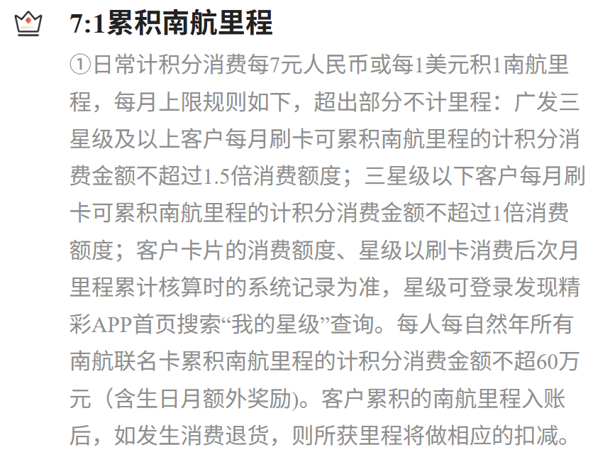 4个季度达标,可以获得2560元广发商城券。商城券可购买各类票券或实物,仅此一项便可年费回血。同时,24万消费可获得3.5万南航里程,此一项又是接近2K的收益。