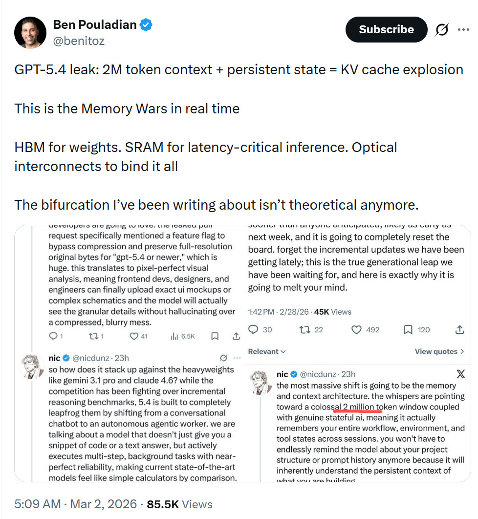 有 X 用户声称,GPT-5.4 的真正突破不在常规推理基准,而在内存与上下文架构。传闻指向一个高达 200 万 token 的上下文窗口,并配合真正的有状态 AI(stateful AI)。这意味着模型不再是会话内记忆,而是能够在不同会话之间保留工作流、环境配置乃至工具状态。