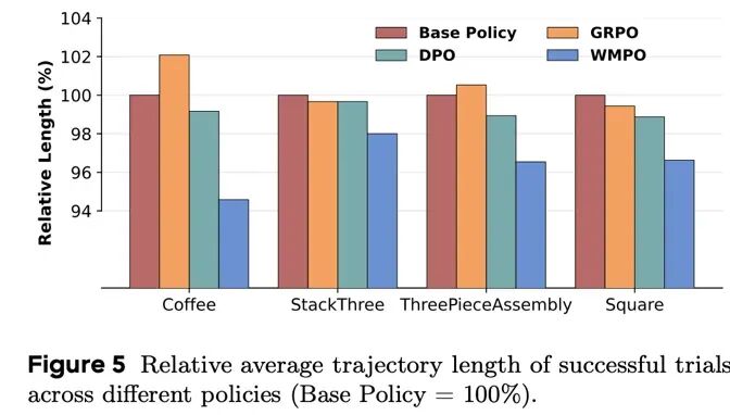 WMPO 训练的策略动作更加连贯、果断,成功轨迹长度明显缩短,减少了犹豫和重复尝试。