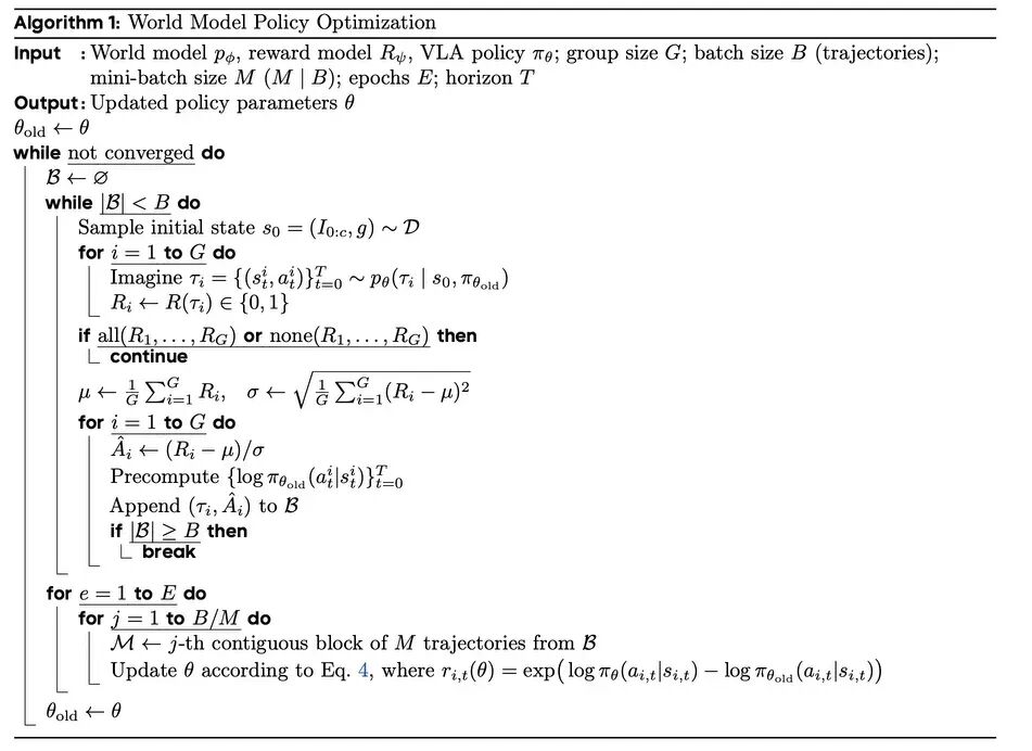 在 “想象” 出的轨迹上,WMPO 最小化以下目标函数,将 VLA 模型从单纯的模仿者转化为自我进化的决策者: