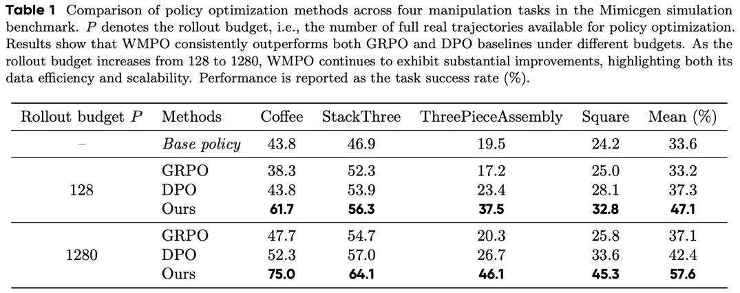 在仅使用 128 条真实轨迹作为数据预算时,WMPO 的成功率已超过最优 Offline RL 基线 9.8%;当预算提升至 1280 条时,领先优势进一步扩大至 15.2%。
