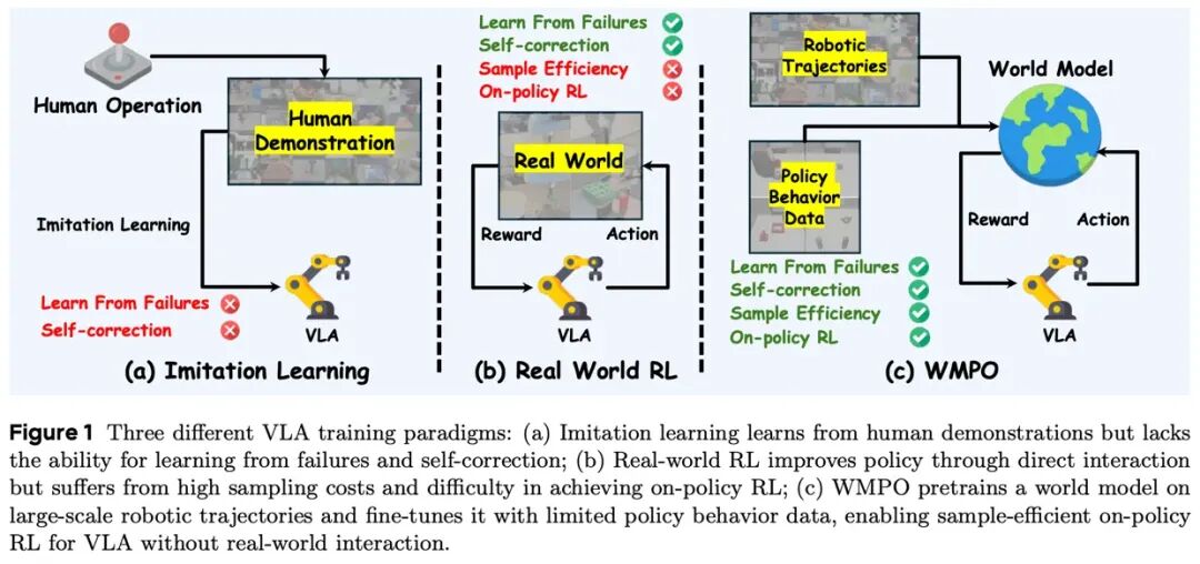 WMPO 提出了一种新的训练范式:将策略优化过程完整地迁移到视觉世界模型中完成,让具身代理在 “想象” 的轨迹中学习如何从错误中恢复。其核心设计包含三个关键要点: