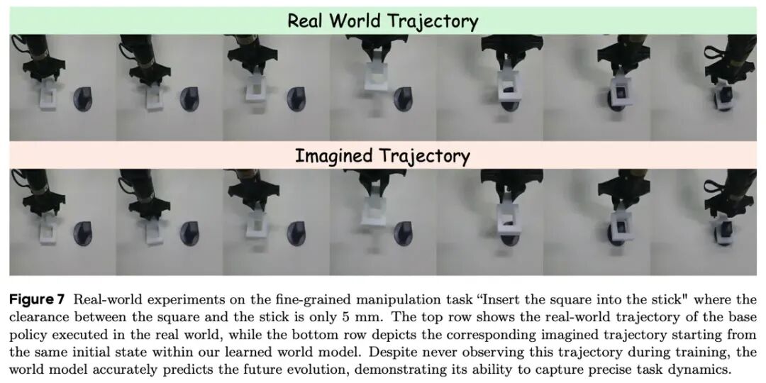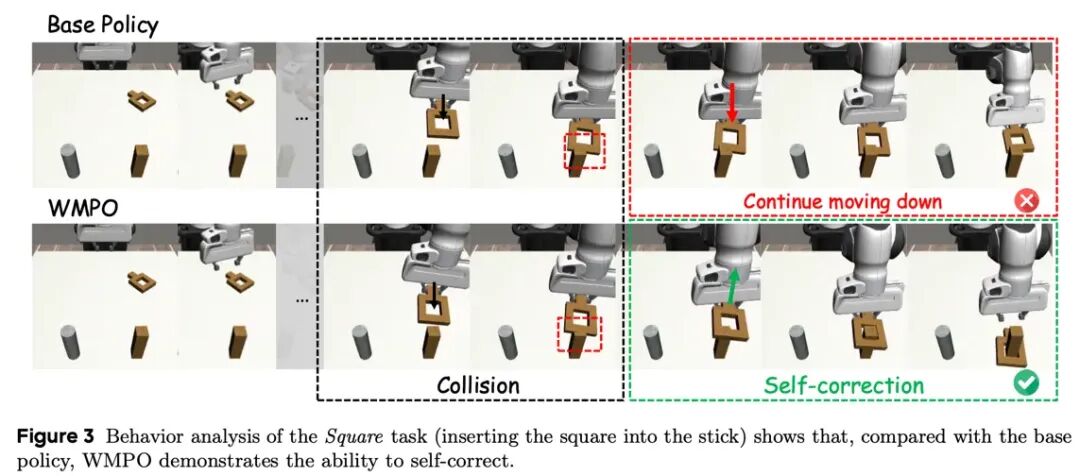 在 “方块套圈” 等任务中,当基座模型因碰撞或姿态偏移而卡死时,WMPO 训练得到的策略会主动调整动作:例如抬起方块、重新对准目标并再次尝试。这类纠错行为并未出现在专家演示数据中,而是通过 “想象中的失败与比较” 自然涌现。