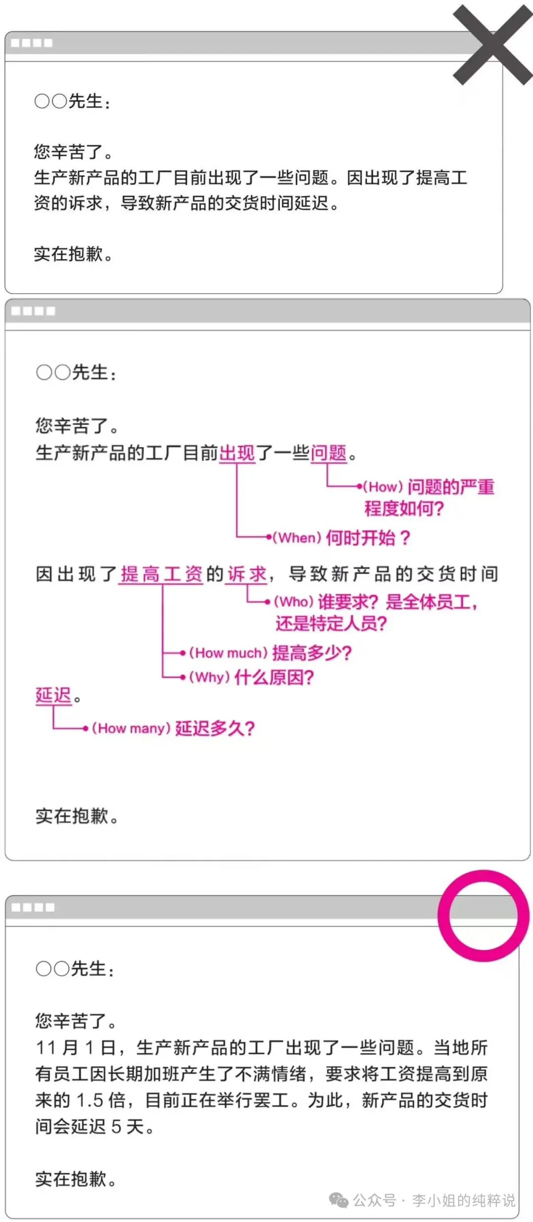 比如文中列举的这个例子:如何汇报工作中的问题。第一张图是错误示范,中间是作者的修改思路,最下面一张是修改后的成稿。有问题、给方法、有目标,我个人挺喜欢这种学习方式的。当然作者在文中还有非常多的案例教学,包括如何发公告、面对领导询问意见时要如何回答等。