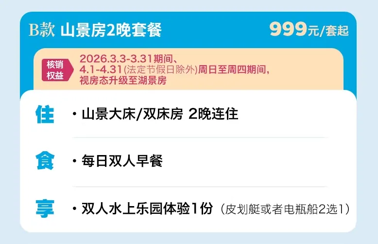 湖景房1晚+双早,599元;山景房2晚连住+双早+双人水上乐园体验,999元。