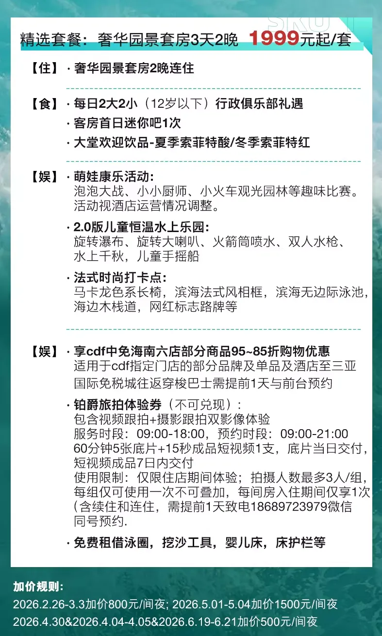 奢华园景套房2晚+每日2大2小行政礼遇+酒店礼遇等,1999元。
