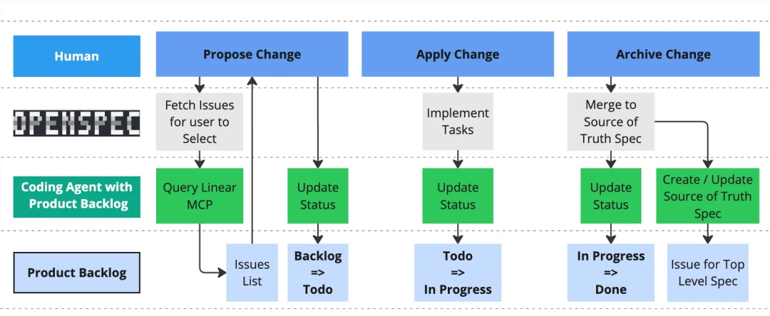 在图 5-b 所示的改进工作流中,我们通过 MCP 与产品待办清单集成,采用适当的状态来对问题进行更新。这与默认通过 CLI 输入变更提议的方式不同: