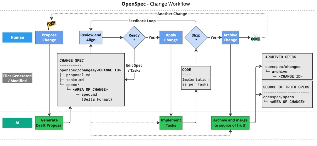 OpenSpec 采用三步式 SDD 工作流,变更通常会经过“提议”、“应用”和“归档”三个阶段。