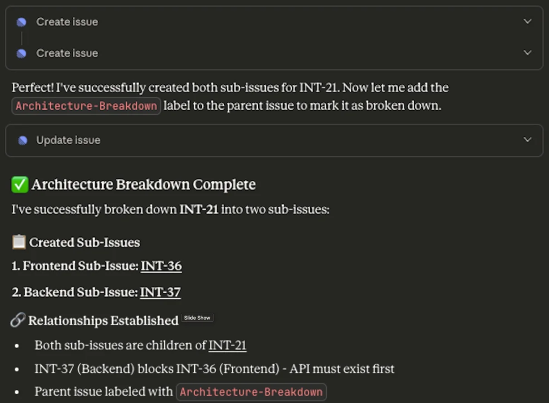 重要的是,架构师无需手动分解每个用户故事。相反,他们可以通过定义仓库边界、集成模式与架构约束为智能体搭建执行框架。在上下文的指导下,智能体能够自动将这些规范应用到新的用户故事中,为每个受影响的仓库生成对应的子问题。