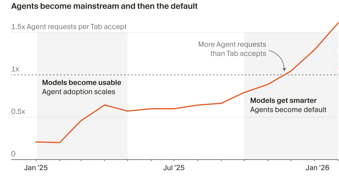 数据显示,2025 年 3 月,Cursor 的 Tab 用户数量大约是 Agent 用户的 2.5 倍,而现在,这一比例已经反转 ——Agent 用户数量是 Tab 用户的 2 倍,且 Agent 使用量仍在快速攀升。