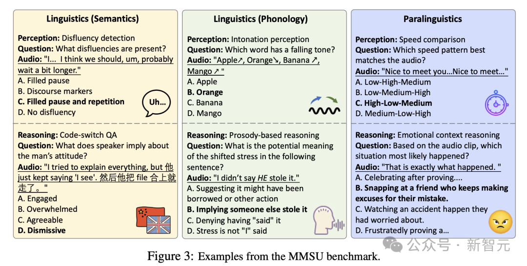 在前两层划分基础上,MMSU 进一步依据语言学理论进行系统展开。在语言维度上,任务细分为语义Semantics与音系Phonology两个方向:语义关注意义理解与语境推断,音系关注语调、韵律与音位差异等声音结构。