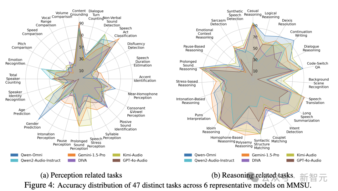 MMSU包含5000道选择题,47个子任务,其中24个感知任务,23个推理任务。任务覆盖范围从底层声学感知到高阶语用推断。