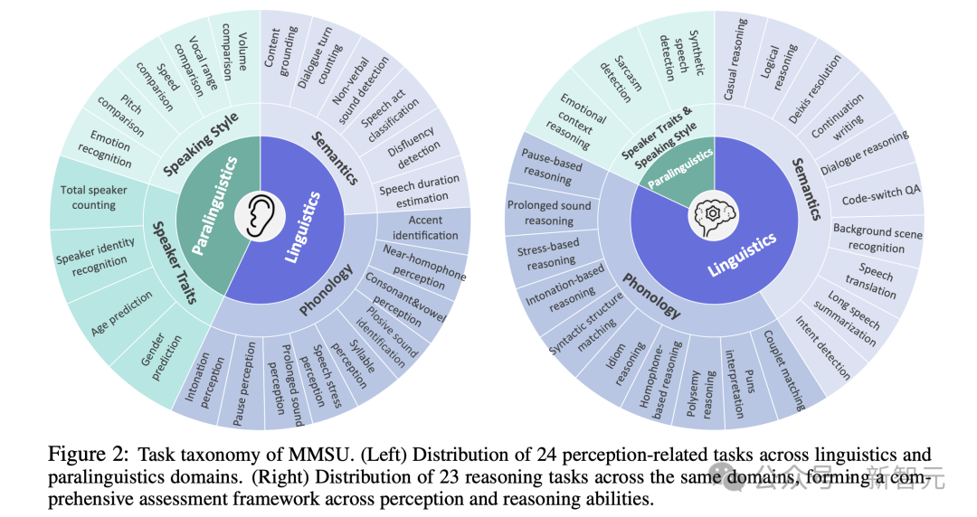 通过这一层展开,MMSU在理论层面将语音理解拆解为语义内容、声音结构、说话人属性与表达风格四个核心分支,使「说了什么」「怎么说」以及「真正想表达什么」能够在统一框架中被精细刻画与系统评估。