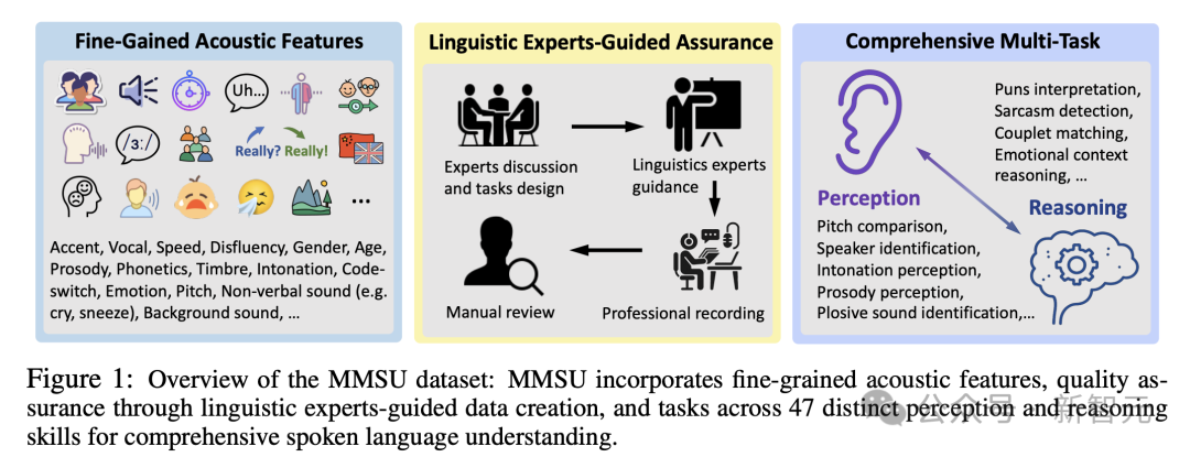 在这一背景下,研究团队提出了MMSU(Massive Multi-task Spoken Language Understanding and Reasoning Benchmark),一个覆盖47个子任务、5,000道选择题的综合性语音理解评测基准,旨在从语言学结构出发,系统刻画SpeechLLMs在多层语言现象下的感知与推理能力,并为语音理解能力建立可分析、可诊断、可比较的统一坐标体系。