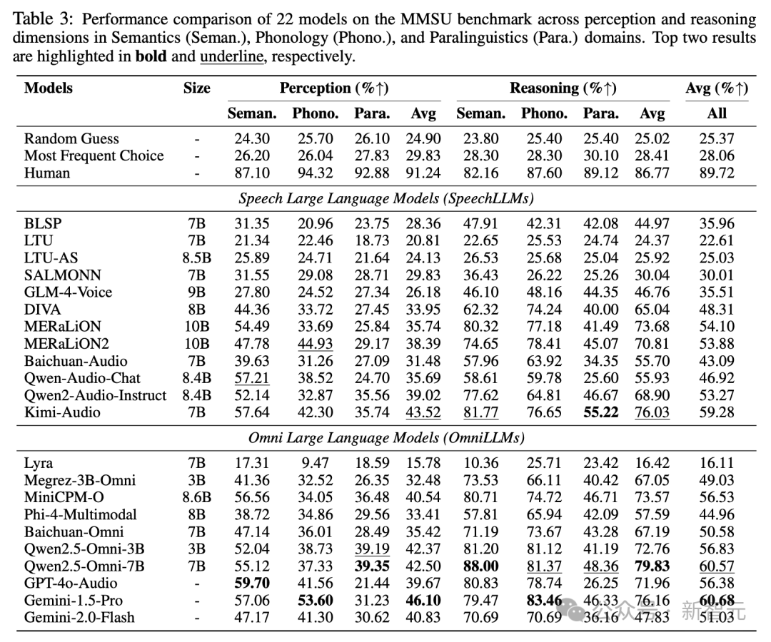 研究团队对22个先进SpeechLLMs与OmniLLMs进行了系统评测。人类参考水平为89.72%,最佳模型(Gemini-1.5-Pro)为60.68%,差距接近30个百分点。
