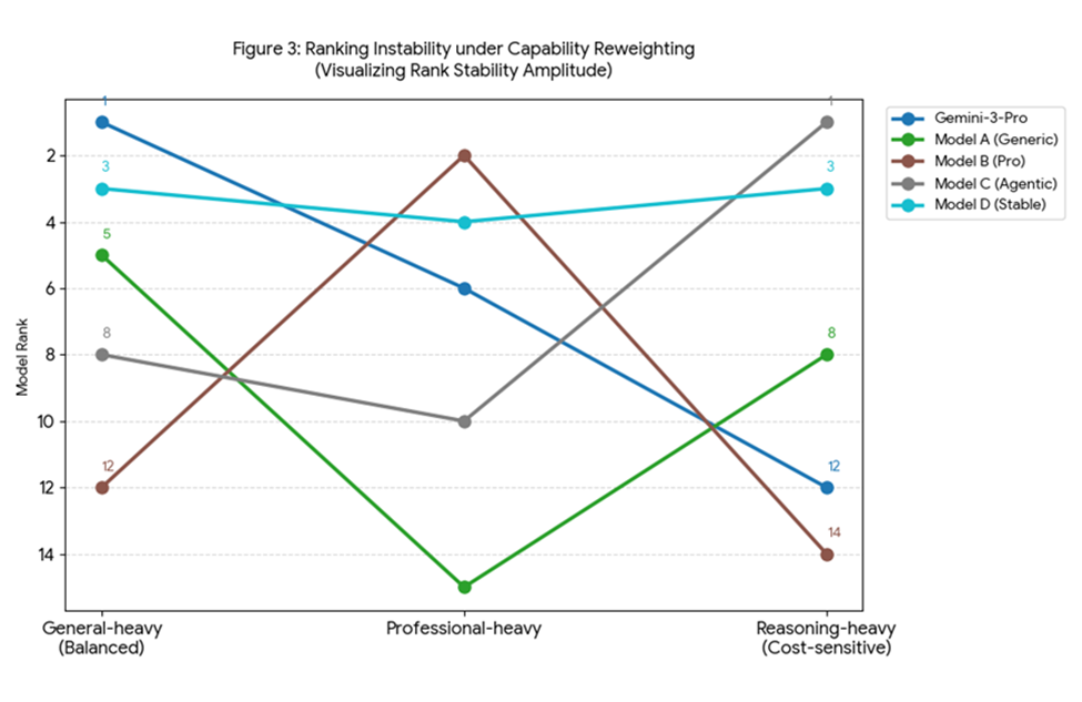研究团队提出了一个新指标:排名稳定性幅度(RSA)。简单说,就是当我们根据需求调整考察重点(比如“我更看重逻辑推理”或“我更看重医疗知识”)时,模型排名的波动有多大。