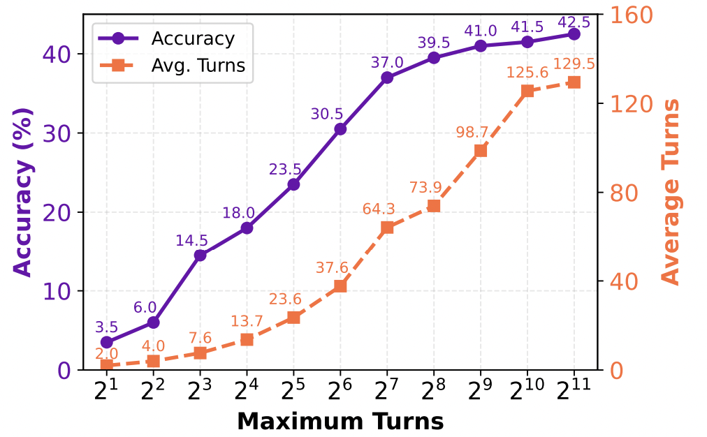 2、IterResearch 强调 Interaction Scaling 特性,即 Agent 交互轮数越多,性能越高。但实际应用中,无限增加交互轮数是否可行?是否存在一个“收益递减点”,超过这个点后,增加交互轮数带来的收益会越来越小,甚至适得其反?