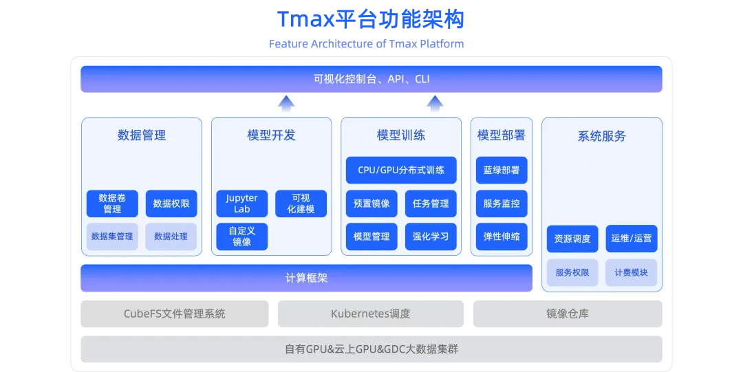 Tmax 平台构建于 Kubernetes 之上,整合了 Kubeflow、自研调度器及 CubeFS 文件管理系统,支持从 Jupyter 交互式开发到分布式训练、再到模型推理部署的全链路 AI 生命周期管理。然而,随着大模型推理业务规模爆发,平台在 资源弹性、数据访问效率与多地域协同 方面面临严峻挑战。