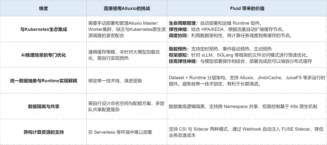 对于我们的大模型推理场景,选择 Fluid 而非直接使用 Alluxio,是基于以下核心判断: