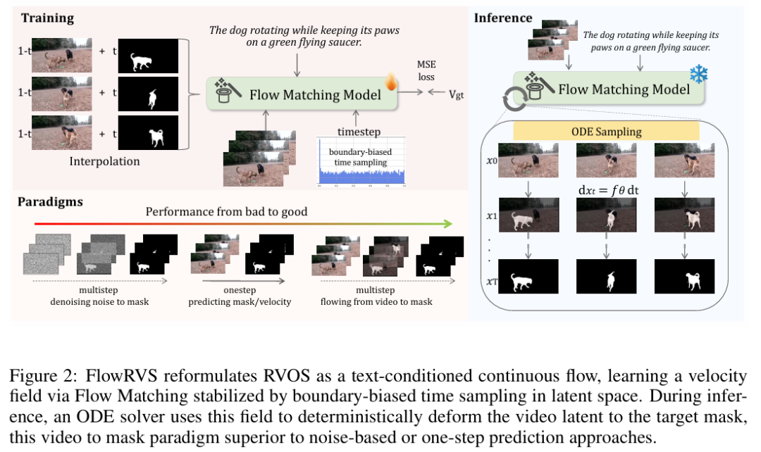 ICLR 2026 论文 FlowRVS 提出了一种新的视频分割范式,利用生成式流匹配将视频转换为 Mask,性能优异,并具有良好的泛化能力。