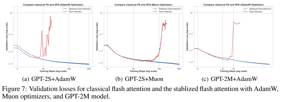 GPT-2S:使用修改后的 FlashAttention,在 AdamW 与 Muon 两种优化器下,都能稳定训练到 600K steps