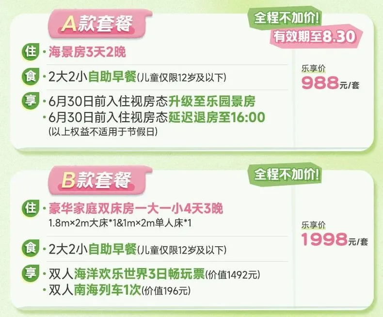 海景房2晚+2大2小早餐,988元;豪华家庭双床房3晚+2大2小早餐+双人3日海洋欢乐世界畅玩+双人海南列车,1998元。以上档位全程不加价!