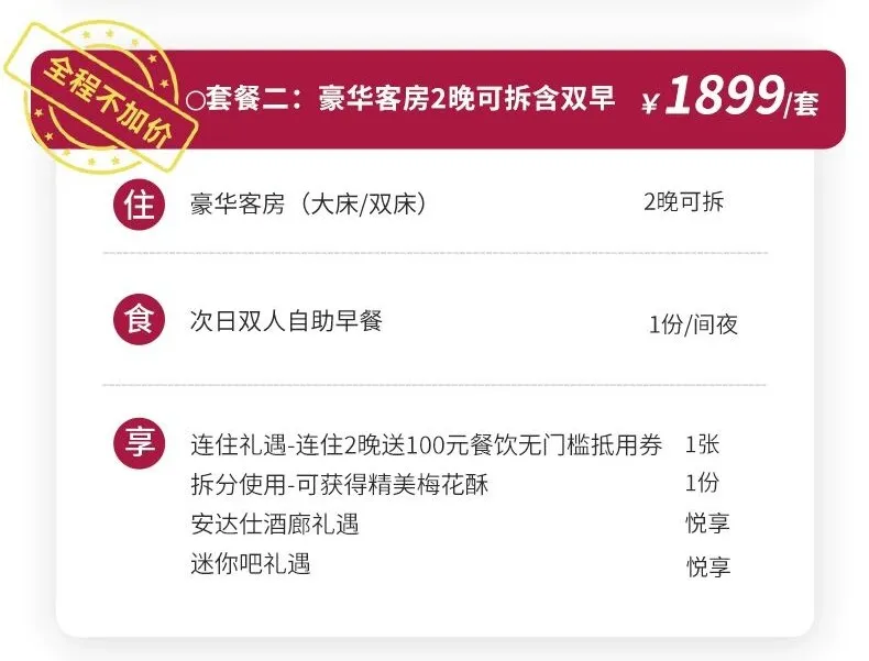 豪华客房2晚+双早+安达仕礼遇等,1899元。此档位全程不加价!