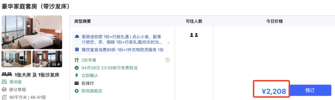 其中长沙君悦给到豪华家庭套房,面积90平米,有1张大床和1张沙发床。日历价2200+/晚,也是住一晚就回本。