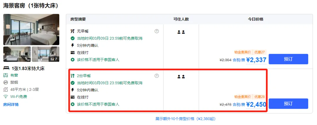 套餐有两种房型可选,尊贵海景露台客房含早,约为65折,还送帆船体验。山景客房送下午茶,想吃早餐的同学入住时付费120元可享双早。