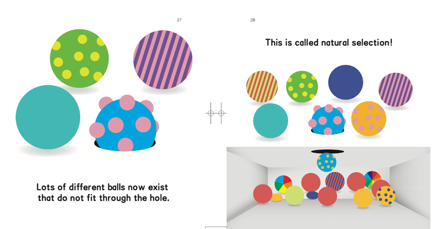 解释自然选择:只有“不会掉进洞里”(适应环境)的球能保留下来,还能继续产生新球,最终形成多样的 “幸存者”。