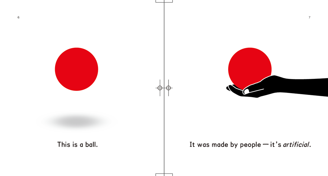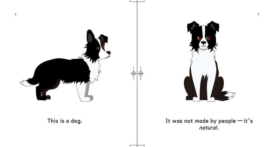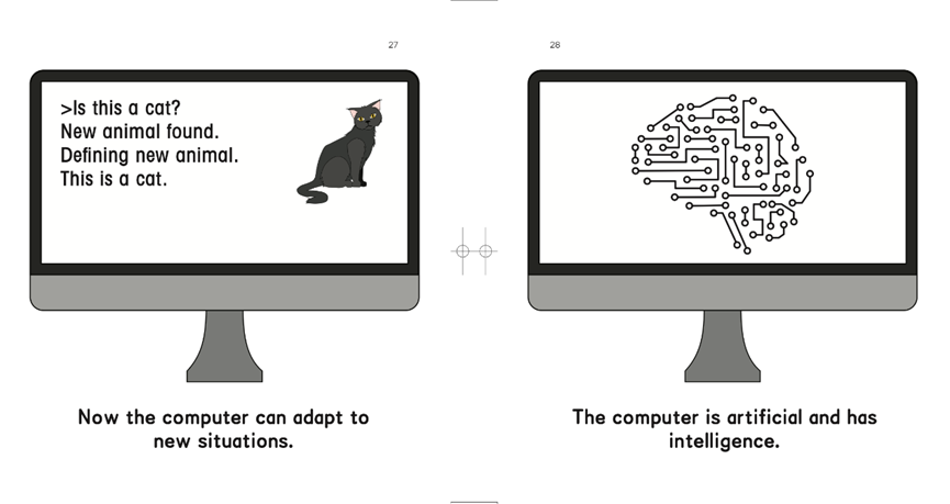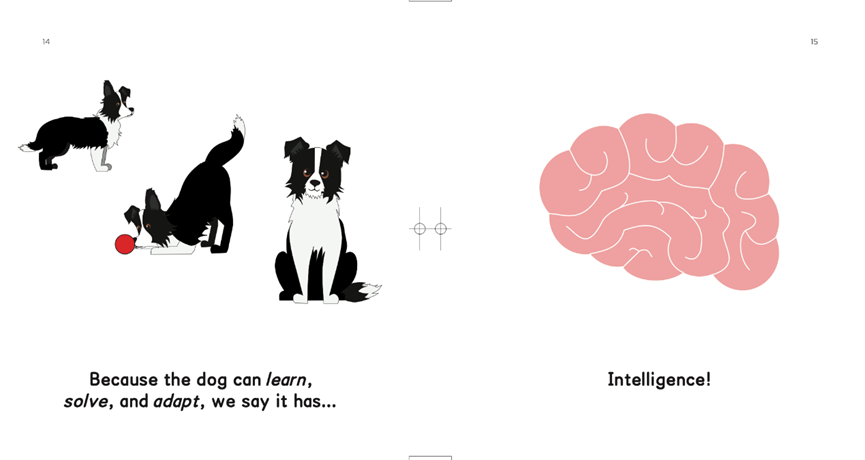 书里先拿“球(人造的)”和“狗(自然的)”做对比,直白告诉孩子:“人工”就是“人制造出来的”;再通过狗能学指令、会挖洞、适应新语言,定义“智能”= 学习 + 解决问题 + 适应新情况的能力。