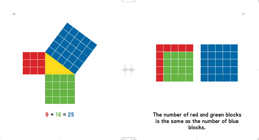 用数字验证规律:通过数方块数量得出9+16=25,让孩子动手证明:两个短边对应的正方形面积之和,等于最长边对应的正方形面积。