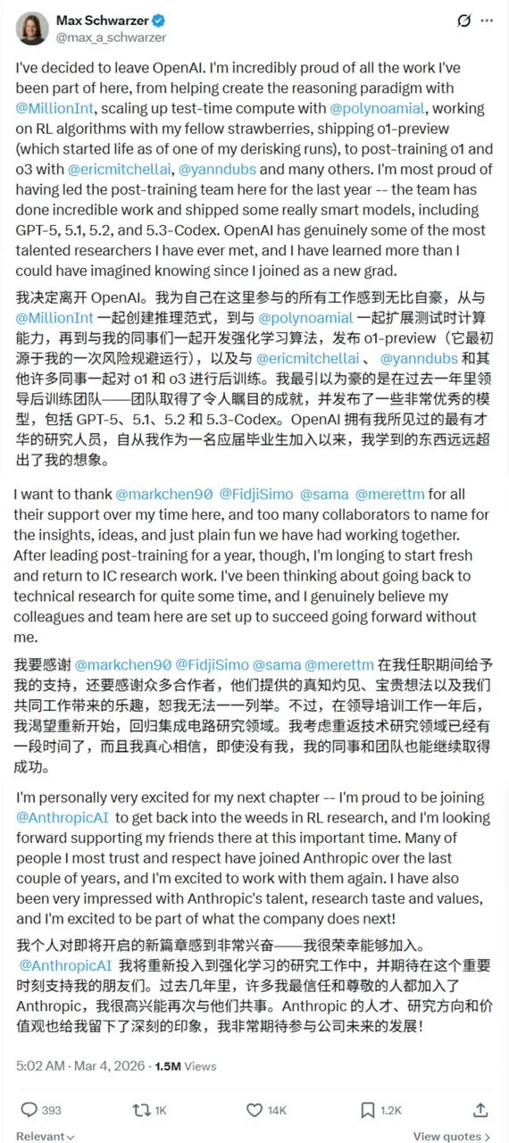 OpenAI 后训练负责人、GPT-5 系列的核心推手 Max Schwarzer 宣布离职,转身加入 Anthropic,回归一线研究员身份。