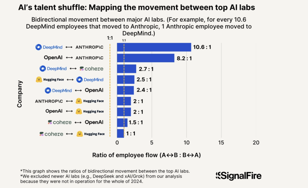 在风险投资公司 SignalFire 最新发布的 2025 人才趋势报告中,Anthropic 顶尖 AI 人才的留存率达到 80%,而且工程师从 OpenAI 跳槽到 Anthropic 的可能性是从 Anthropic 转投 OpenAI 的 8 倍。